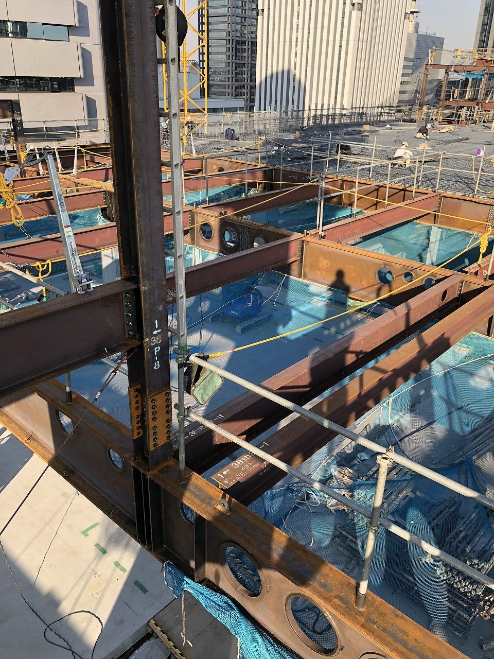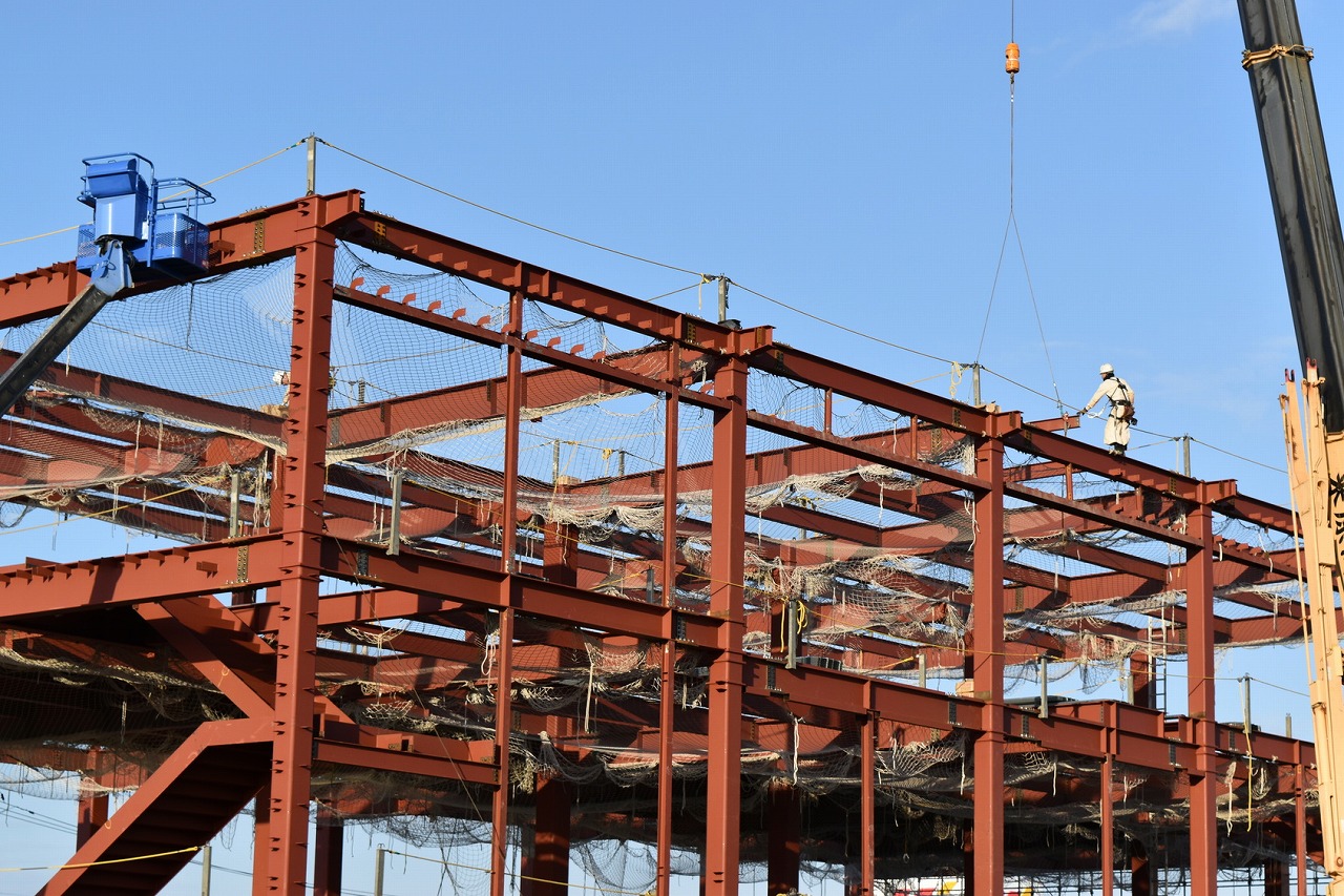 建造物の骨となる、鉄骨を組み上げる作業です。 命綱となる安全帯を架ける設備を整え、開口部には落下防止のための、水平ネットを張り、 外周部分には、飛散防止用の垂直ネットを張り、作業を行います。 難易度が高く、熟年の職人の技が必要とされます。一つ間違えれば命を落とします。 株式会社喜多工業では社員の安全、健康管理を考え、事故のないよう最善の努力をいたしております。